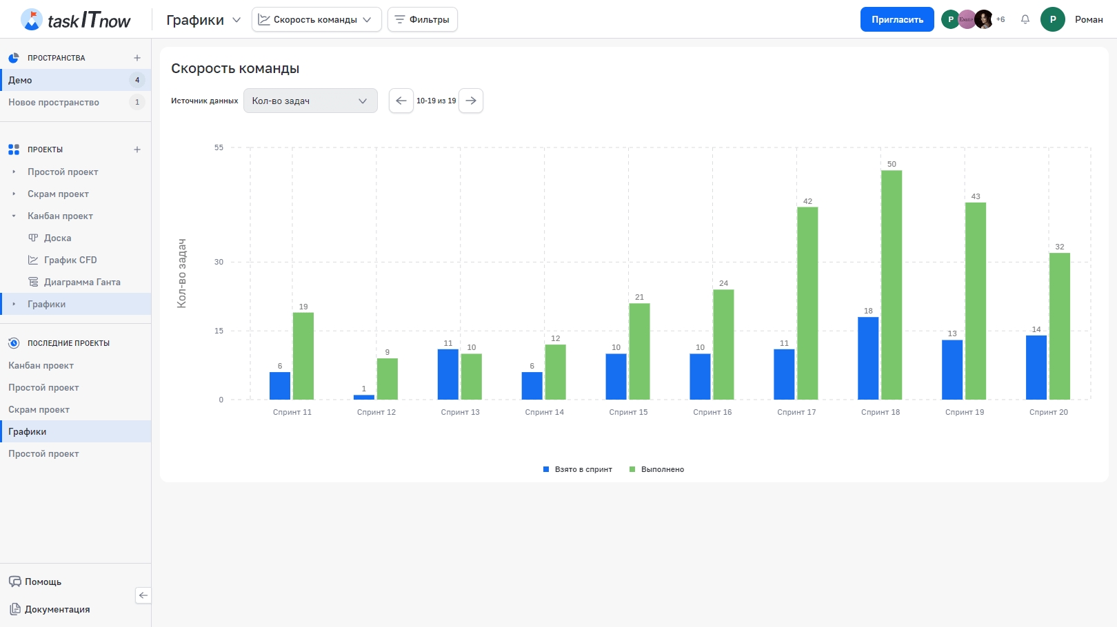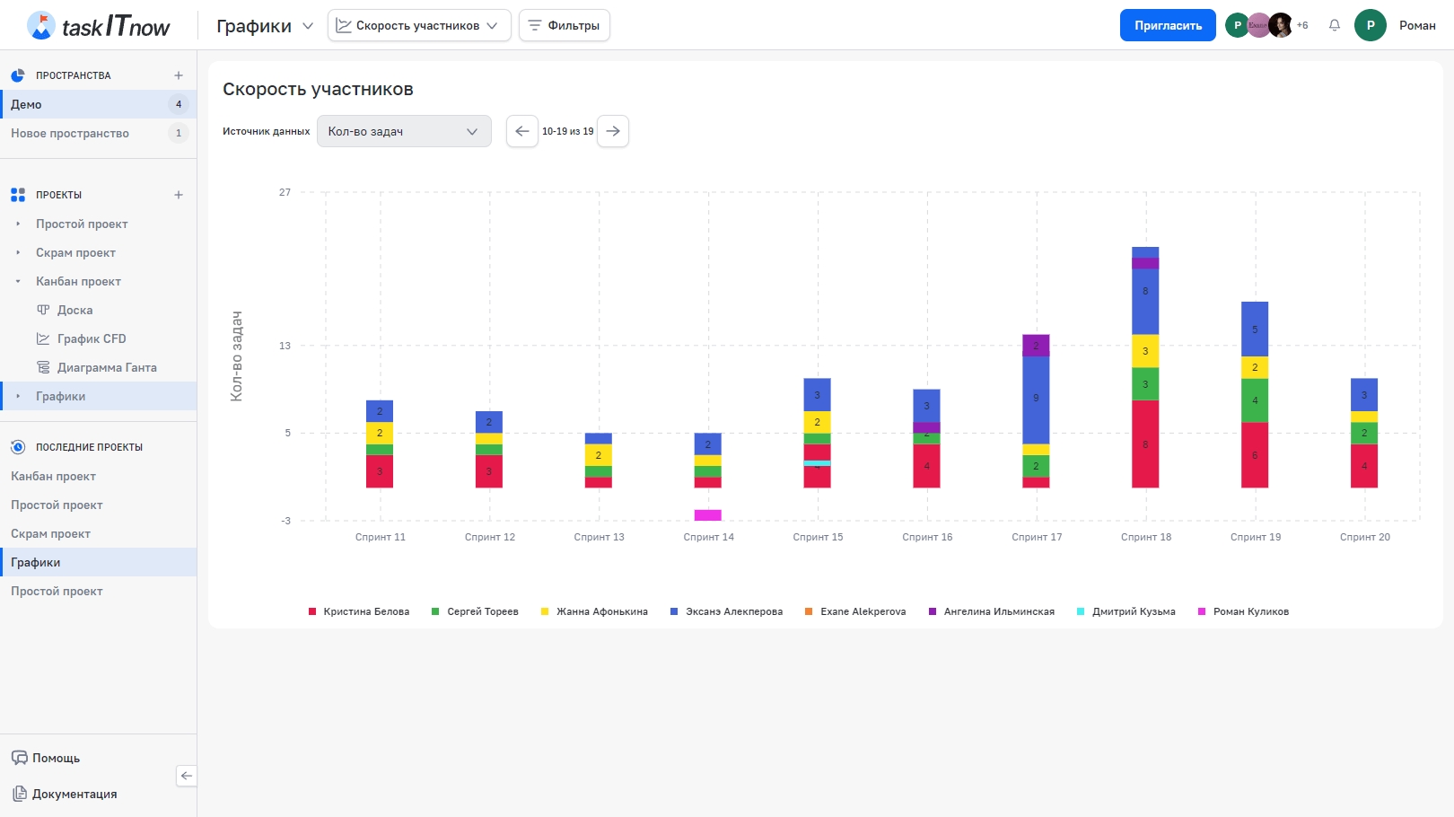 Раздел включает два представления: Скорость команды и Скорость участников.