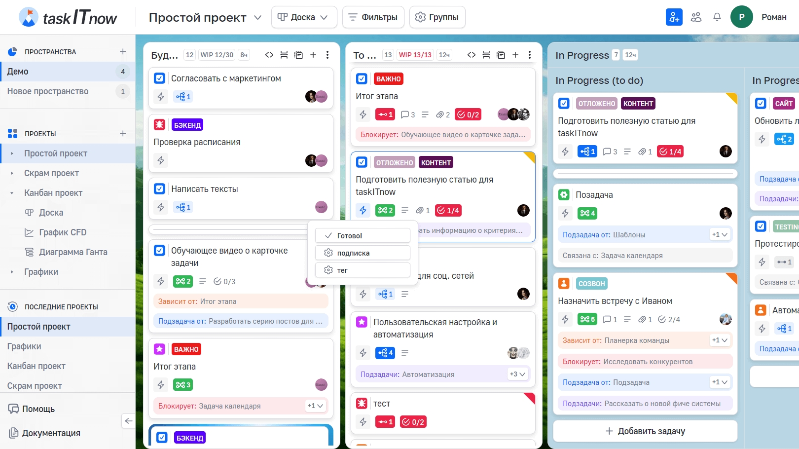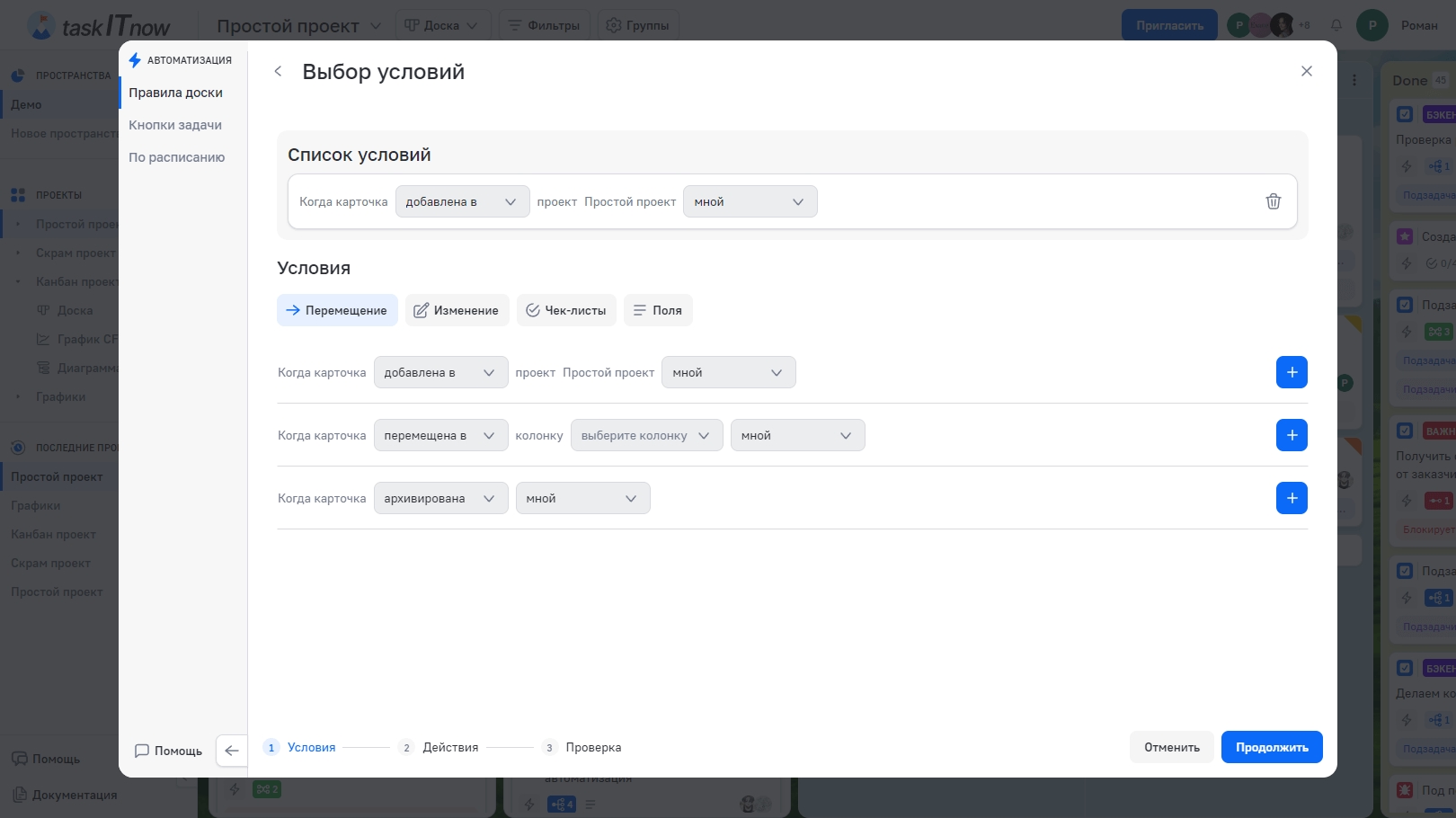 Автоматизация позволяет настроить правила, которые выполняют действия автоматически — при событиях на доске, по нажатию кнопки или по расписанию. Доступ к настройкам — через меню проекта → «Автоматизация».