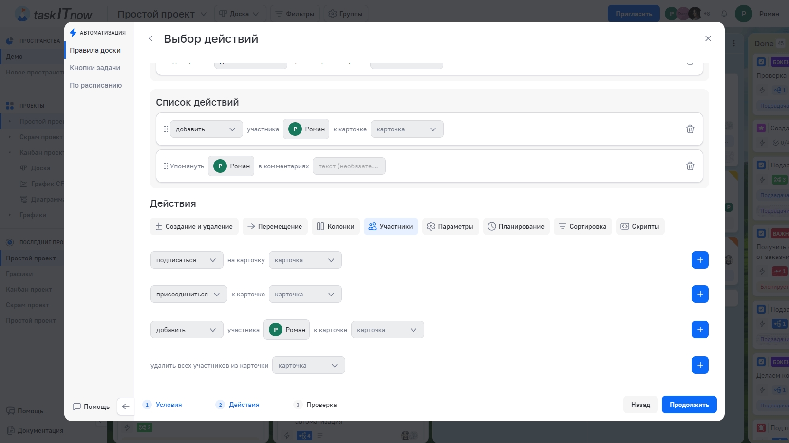 Шаг 2 — Действия: добавьте одно или несколько действий (те же типы, что и у правил доски).