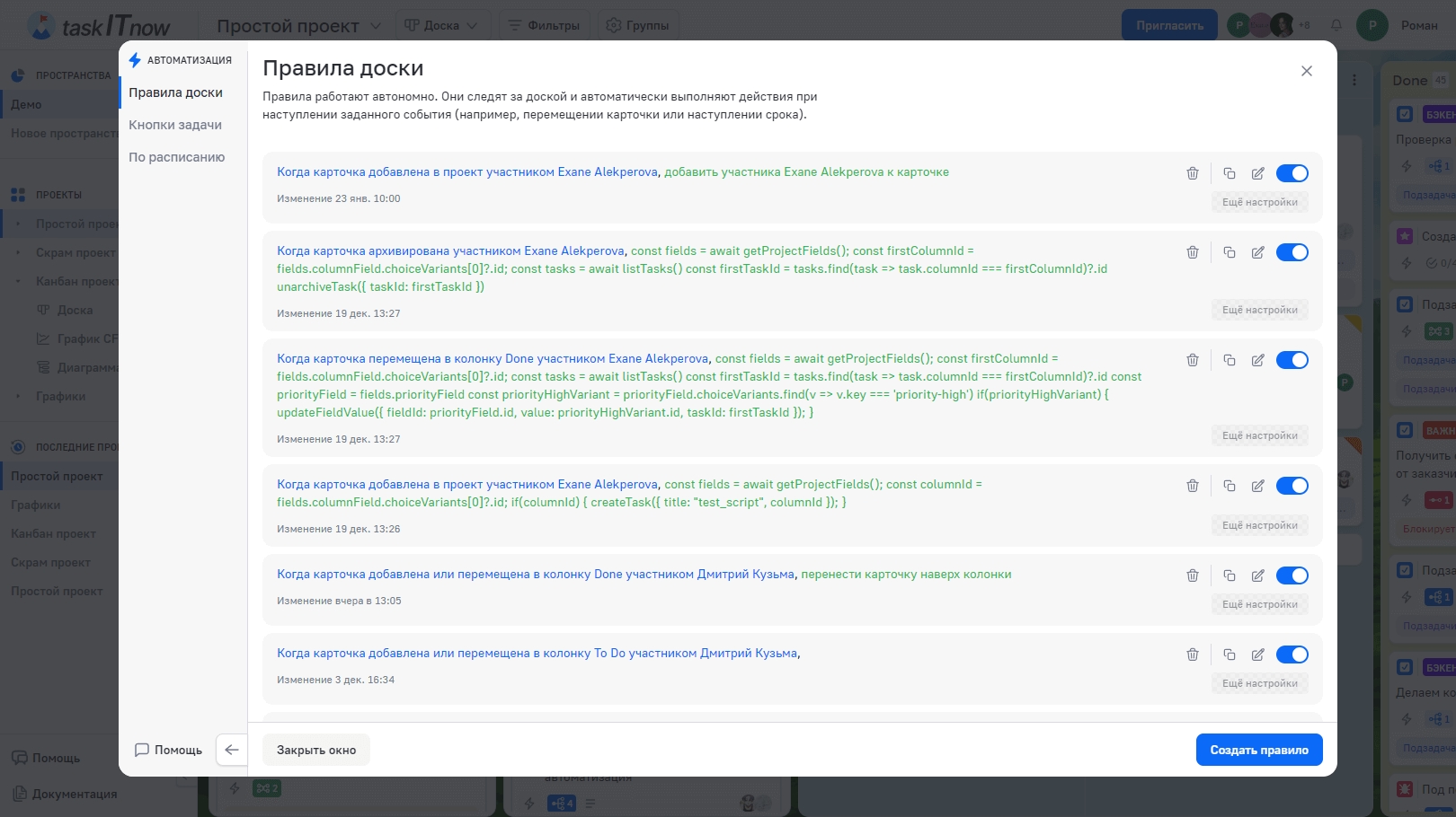 Правила доски | Срабатывают автоматически при событиях (перемещение задачи, изменение поля и т. д.) |