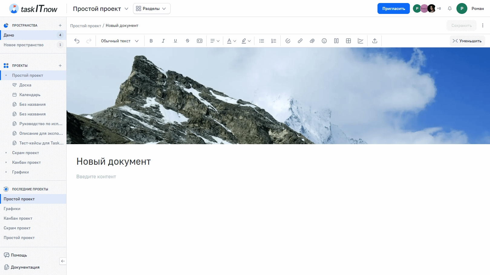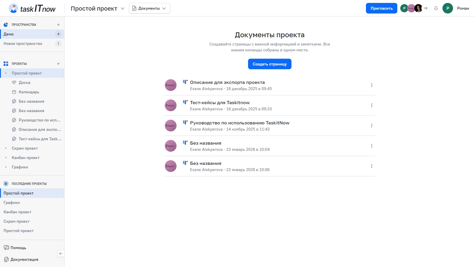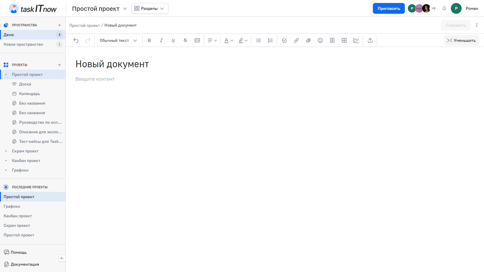 Документы позволяют создавать и редактировать страницы с важной информацией прямо внутри проекта: описания, инструкции, требования, заметки. Поддерживается совместное редактирование в реальном времени.