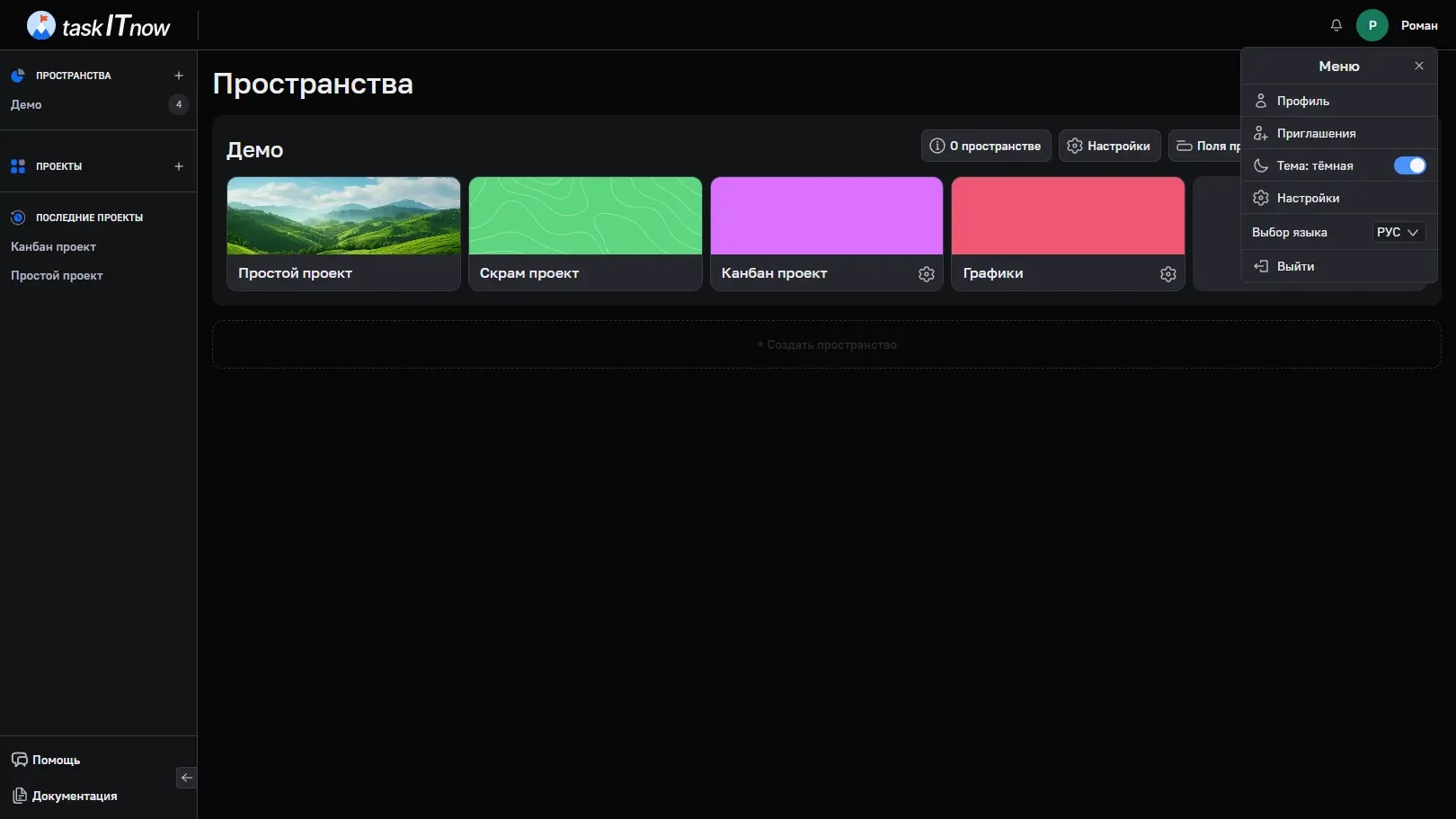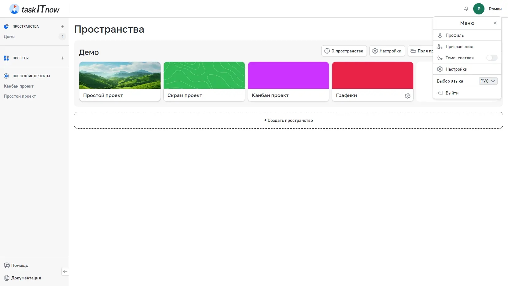 Раздел «Приглашения» показывает все входящие приглашения в пространства и проекты. Рядом с пунктом меню отображается счётчик непрочитанных приглашений.