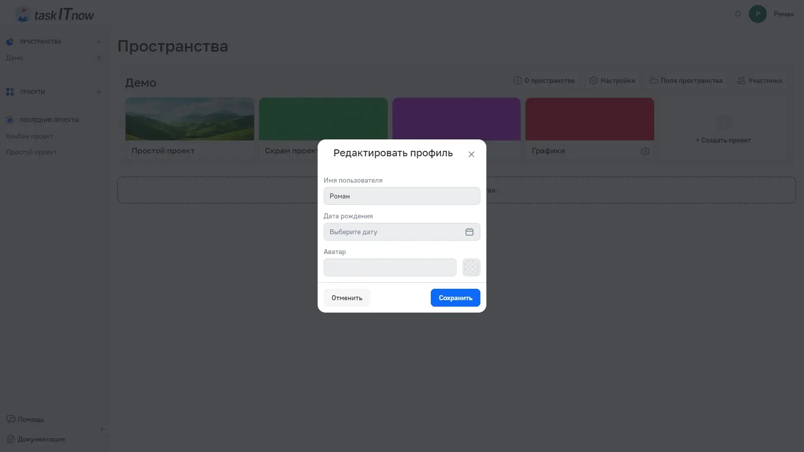 Имя — отображается в задачах, комментариях и списках участников