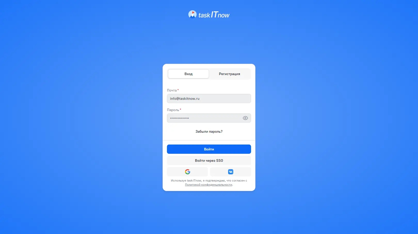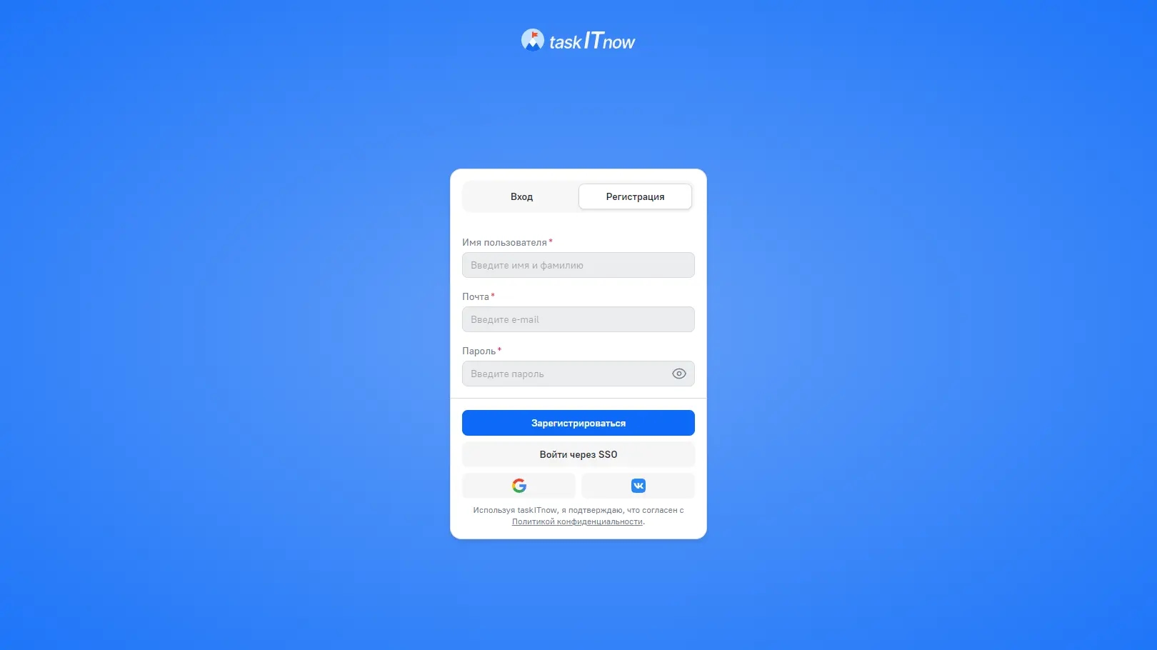 taskITnow предлагает несколько способов создать аккаунт и войти в систему — по электронной почте, через Google, ВКонтакте или корпоративный SSO.
