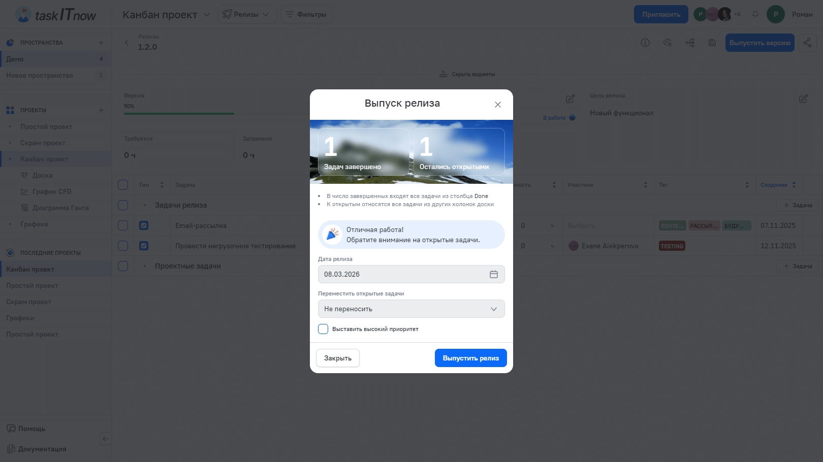 Нажмите кнопку «Выпустить» в таблице релизов или на странице версии. В модальном окне: