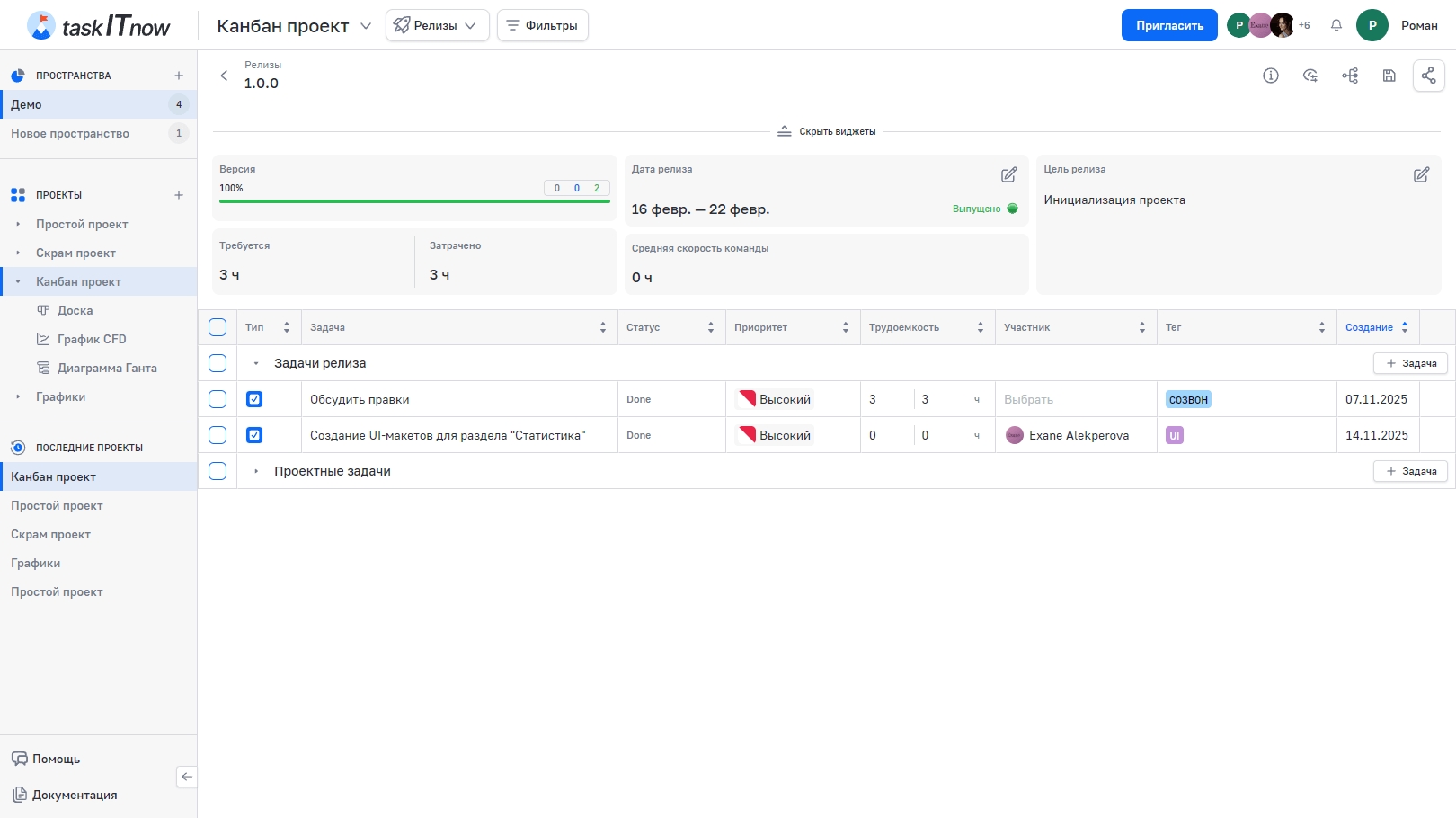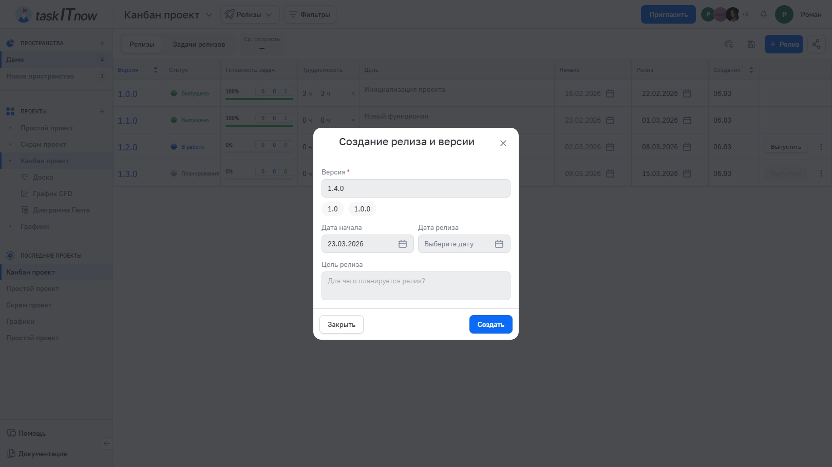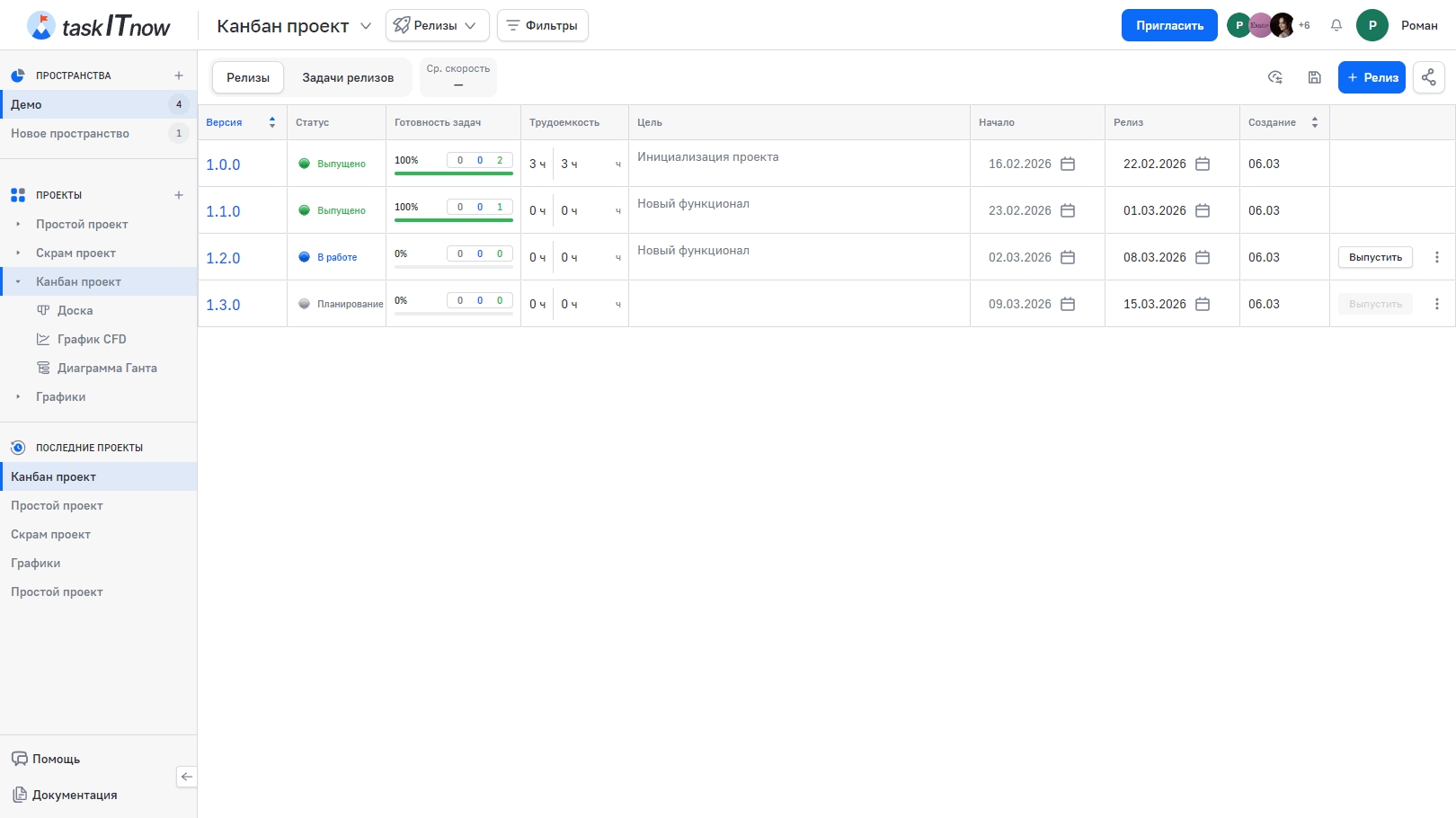 Релизы — инструмент управления версиями продукта. Позволяют группировать задачи по версиям, отслеживать готовность и планировать выпуск.