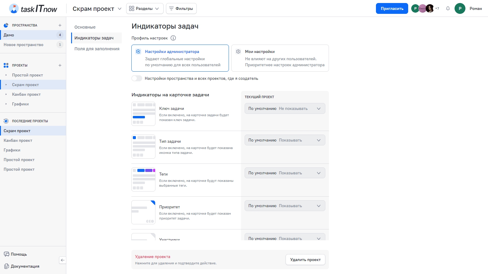 Пространство | Вкладка «Настройки» в пространстве | Параметры для всех проектов пространства |
