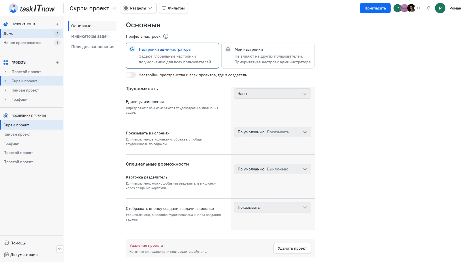 Важно: удаление проекта — необратимое действие. Все задачи, колонки, настройки и данные проекта будут удалены без возможности восстановления.