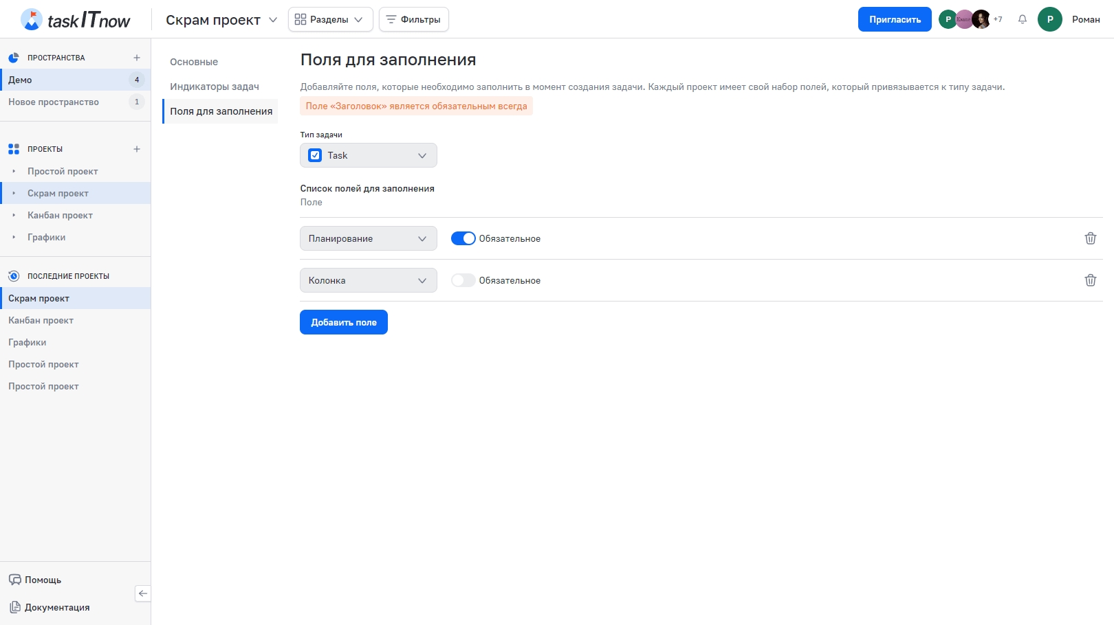 Перейдите в настройки проекта → вкладка «Поля для заполнения».