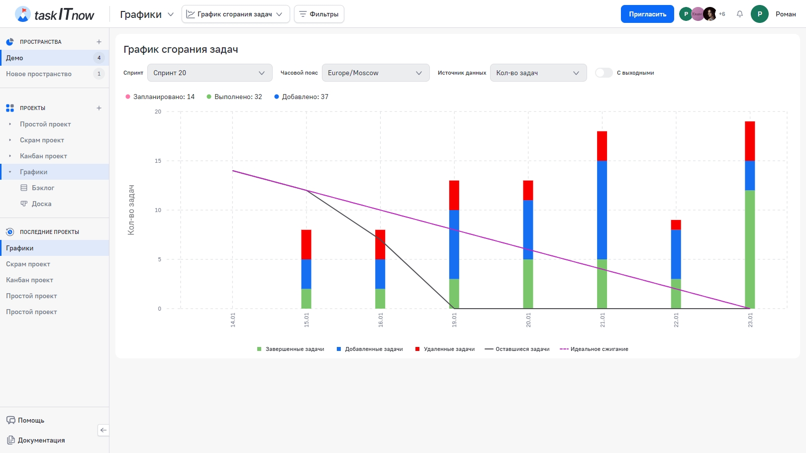 Burndown-диаграмма — показывает, как сгорали задачи в течение спринта. Перейдите через селектор представлений или боковое меню.