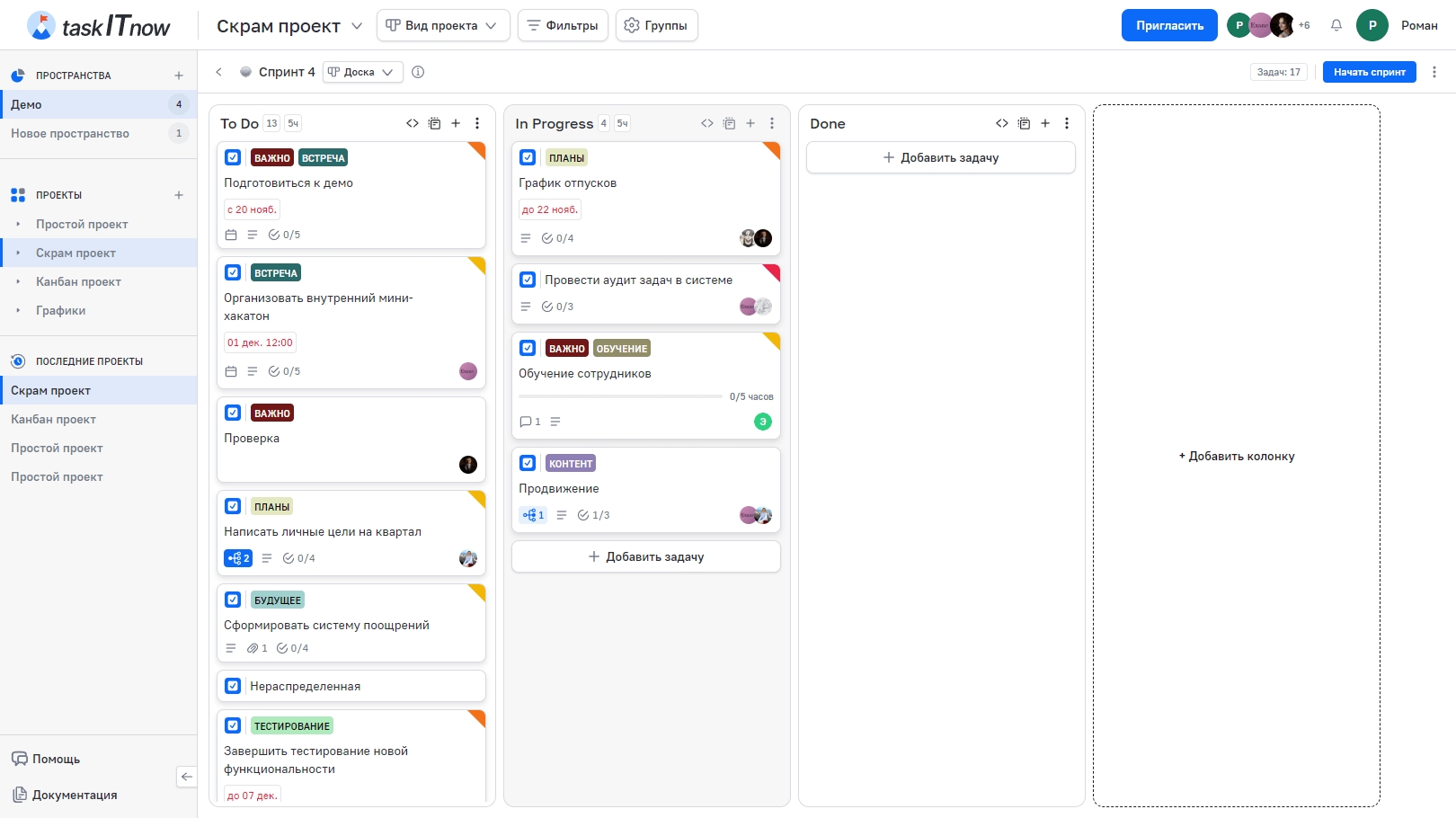 Перетаскивайте карточки между колонками, чтобы отражать прогресс.