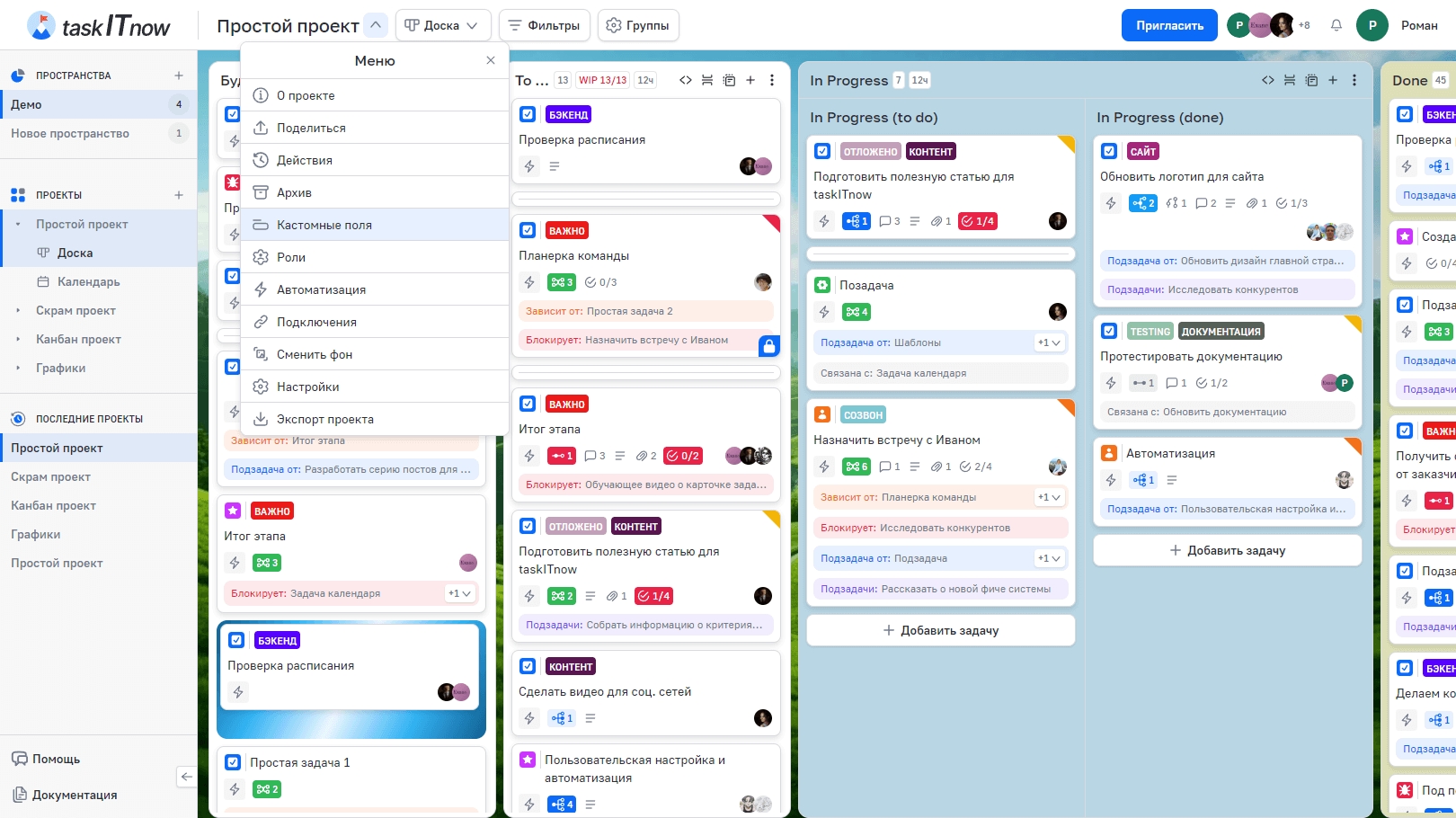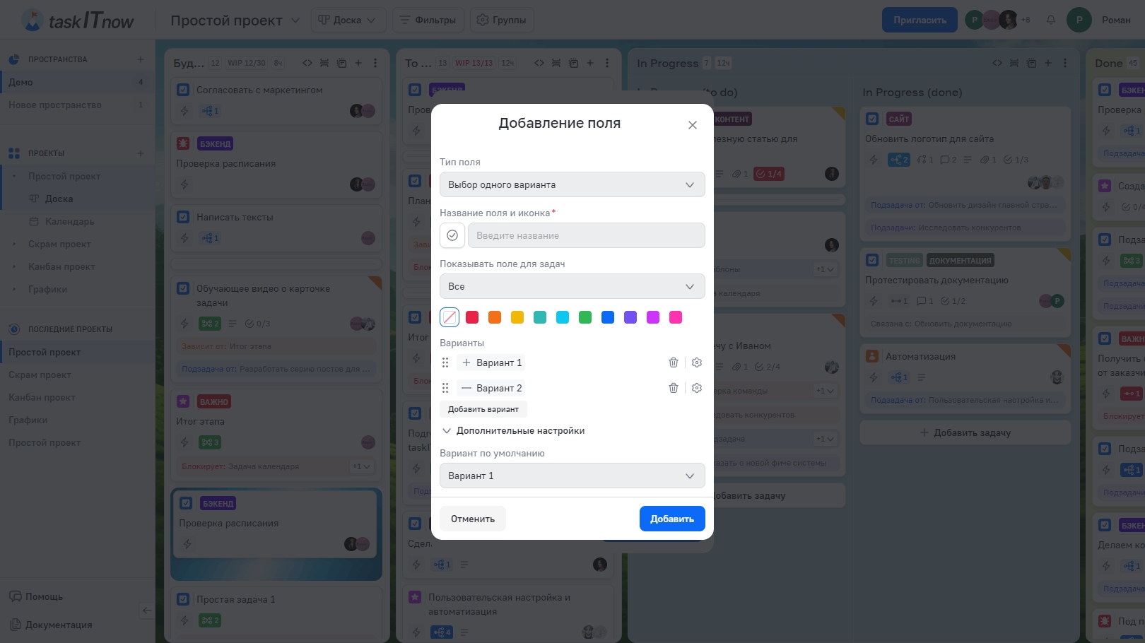 Кастомные поля позволяют расширить стандартный набор данных в задачах и проектах. Вы можете добавлять свои поля с нужным типом данных, настраивать их внешний вид и определять, для каких типов задач они будут отображаться.
