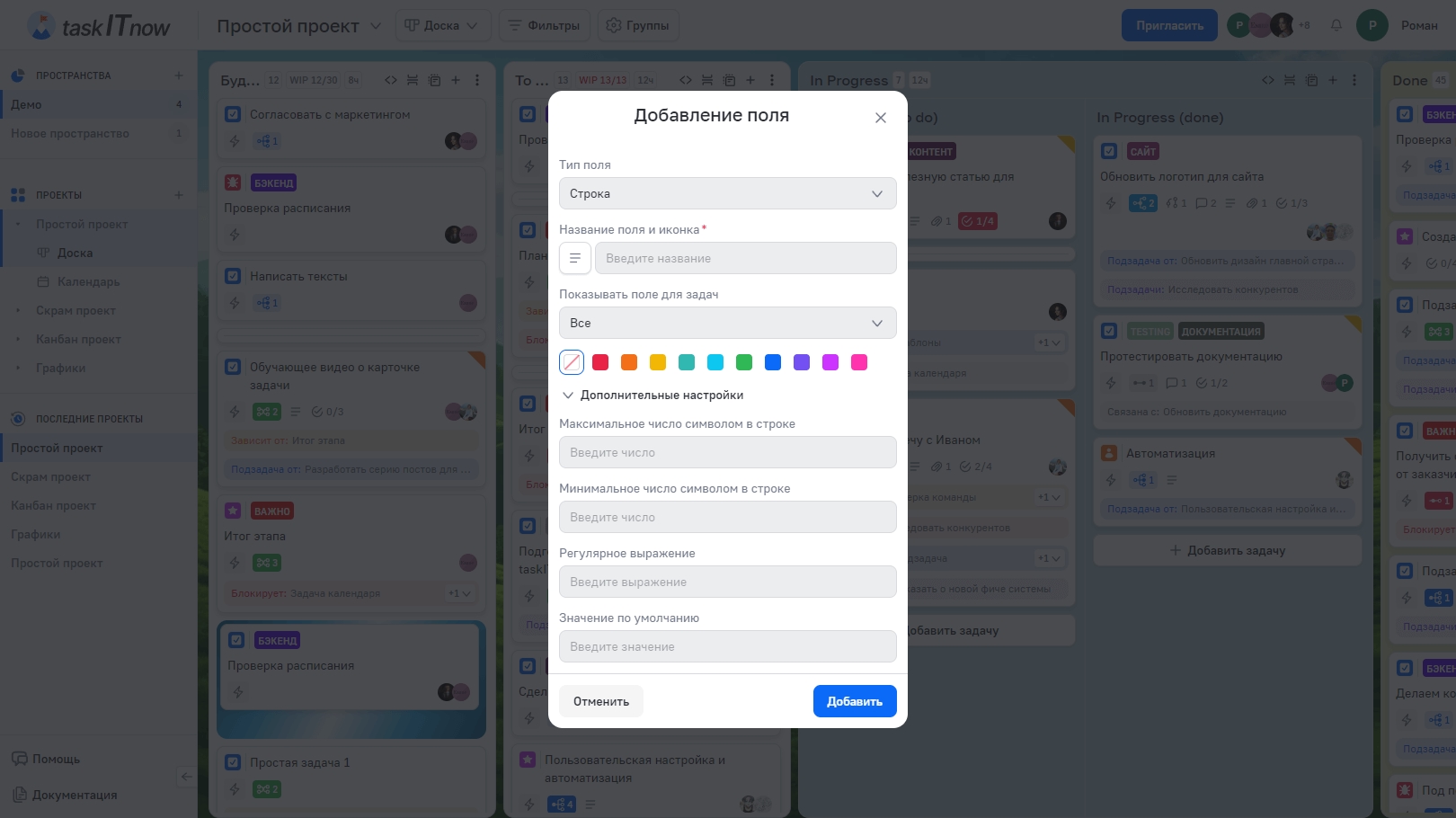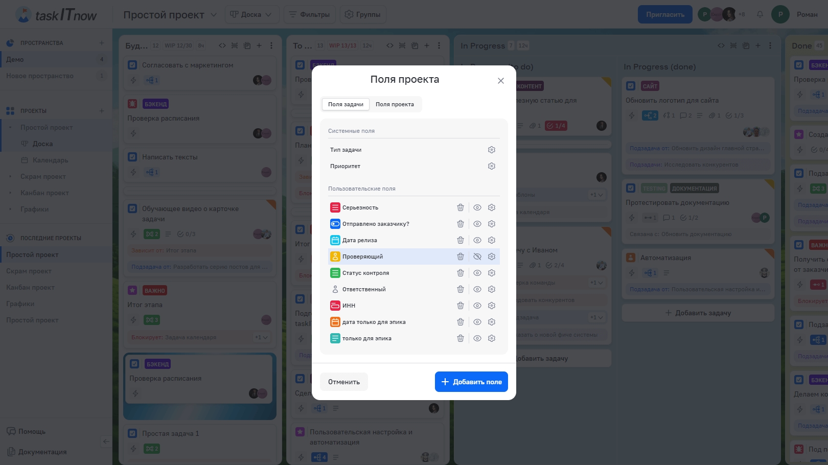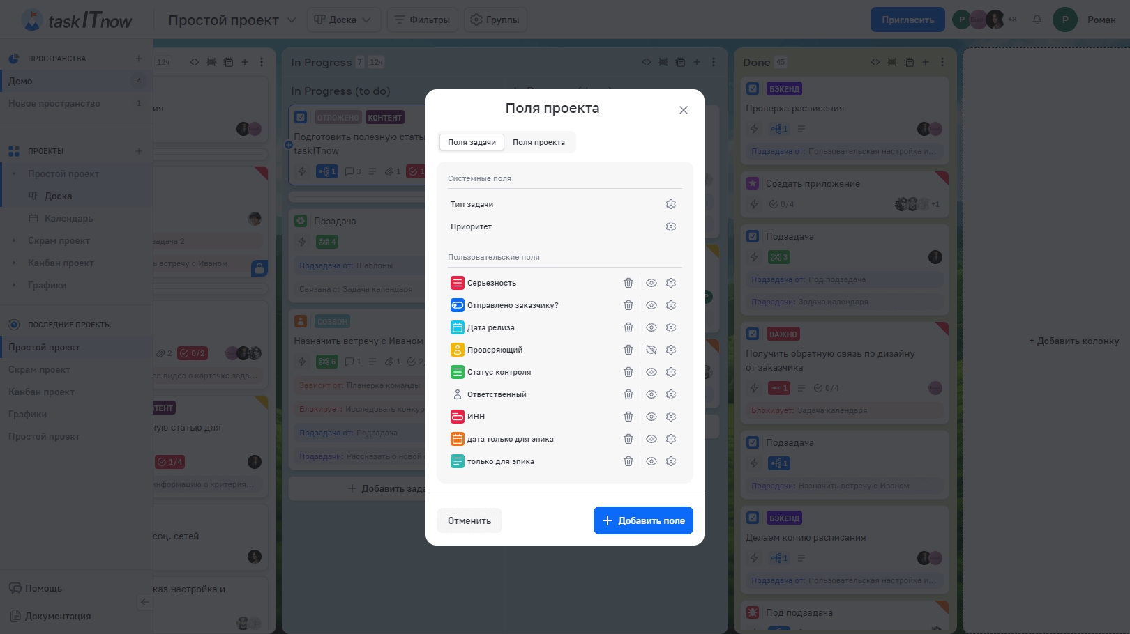 Поля пространства | Поля, созданные на уровне пространства. Доступны во всех проектах пространства. Их можно скрыть для конкретного проекта |