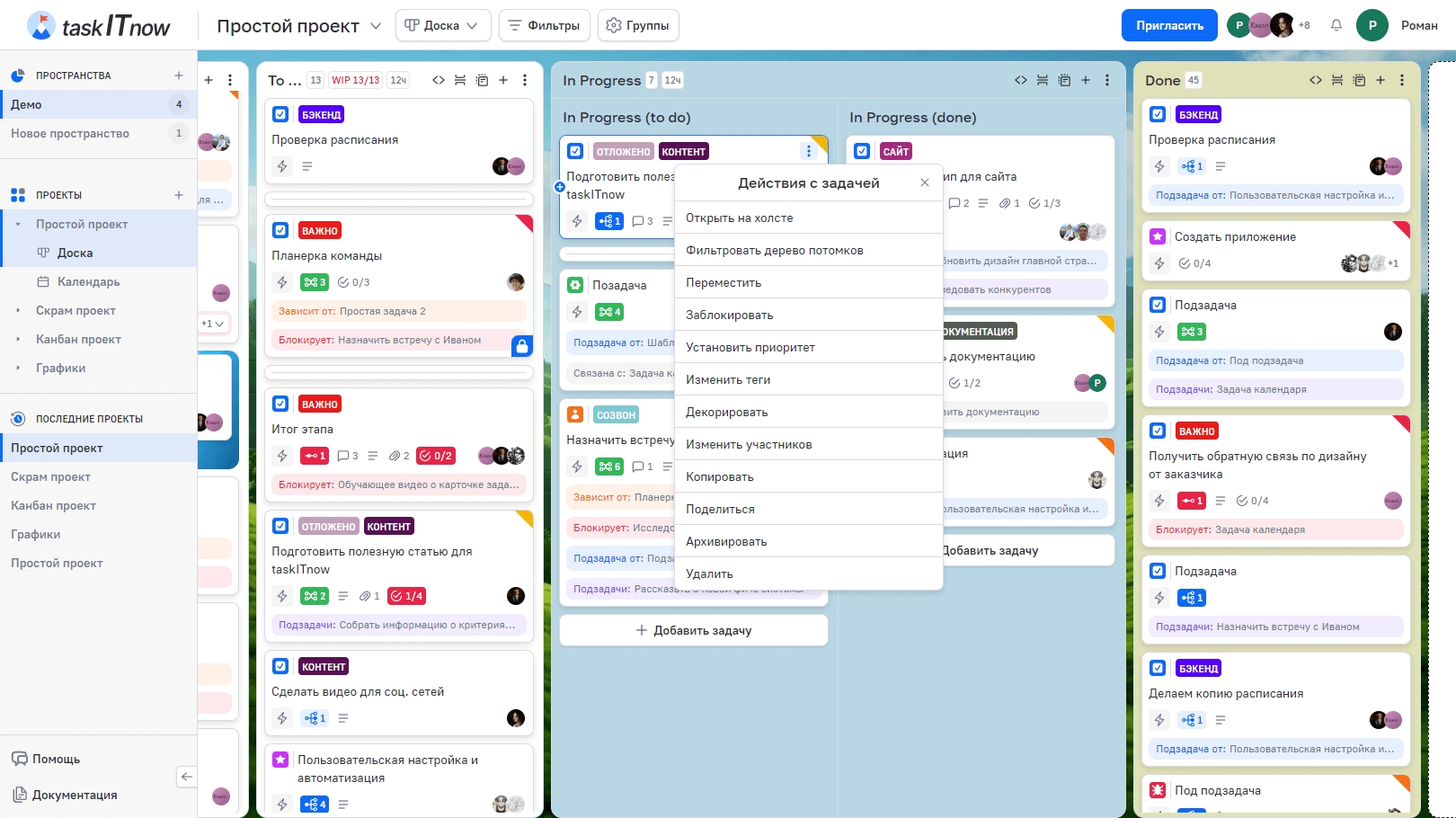 Карточка задачи — это миниатюрное представление задачи на доске. Она отображается в колонке и содержит ключевую информацию: название, приоритет, участников, теги и другие индикаторы. Клик по карточке открывает окно задачи.