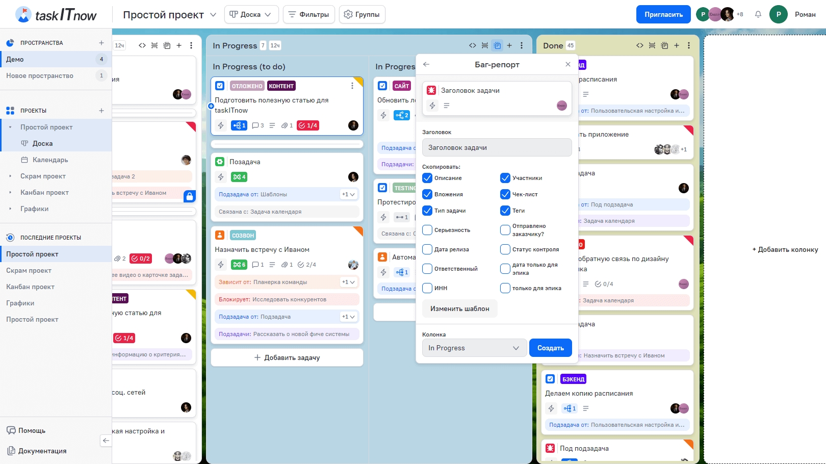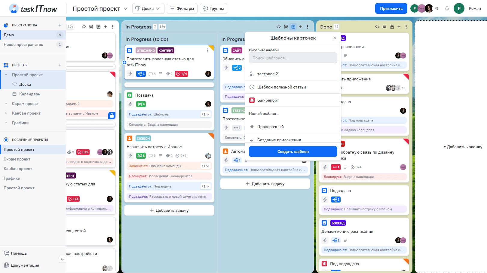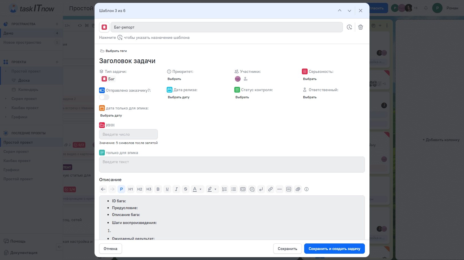 Шаблоны задач позволяют сохранить типовую конфигурацию задачи и быстро создавать новые задачи на её основе. Это удобно, когда вы регулярно создаёте однотипные задачи с одинаковым набором полей, чек-листов и участников.