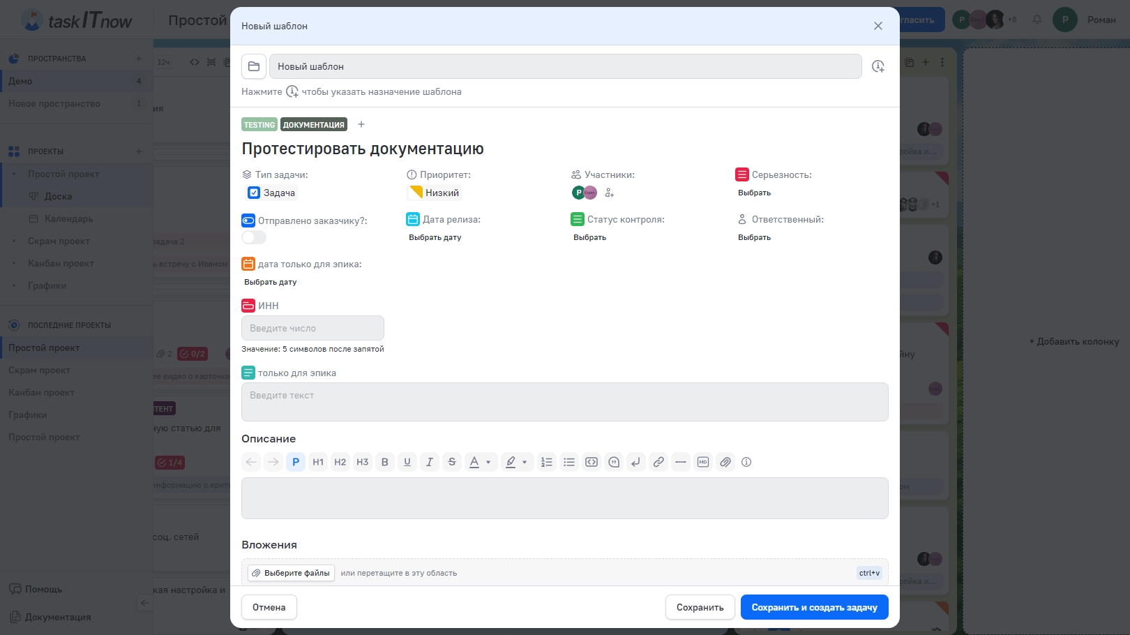Откроется окно настройки шаблона с данными текущей задачи: заголовок, описание, чек-листы, вложения, участники и значения полей.