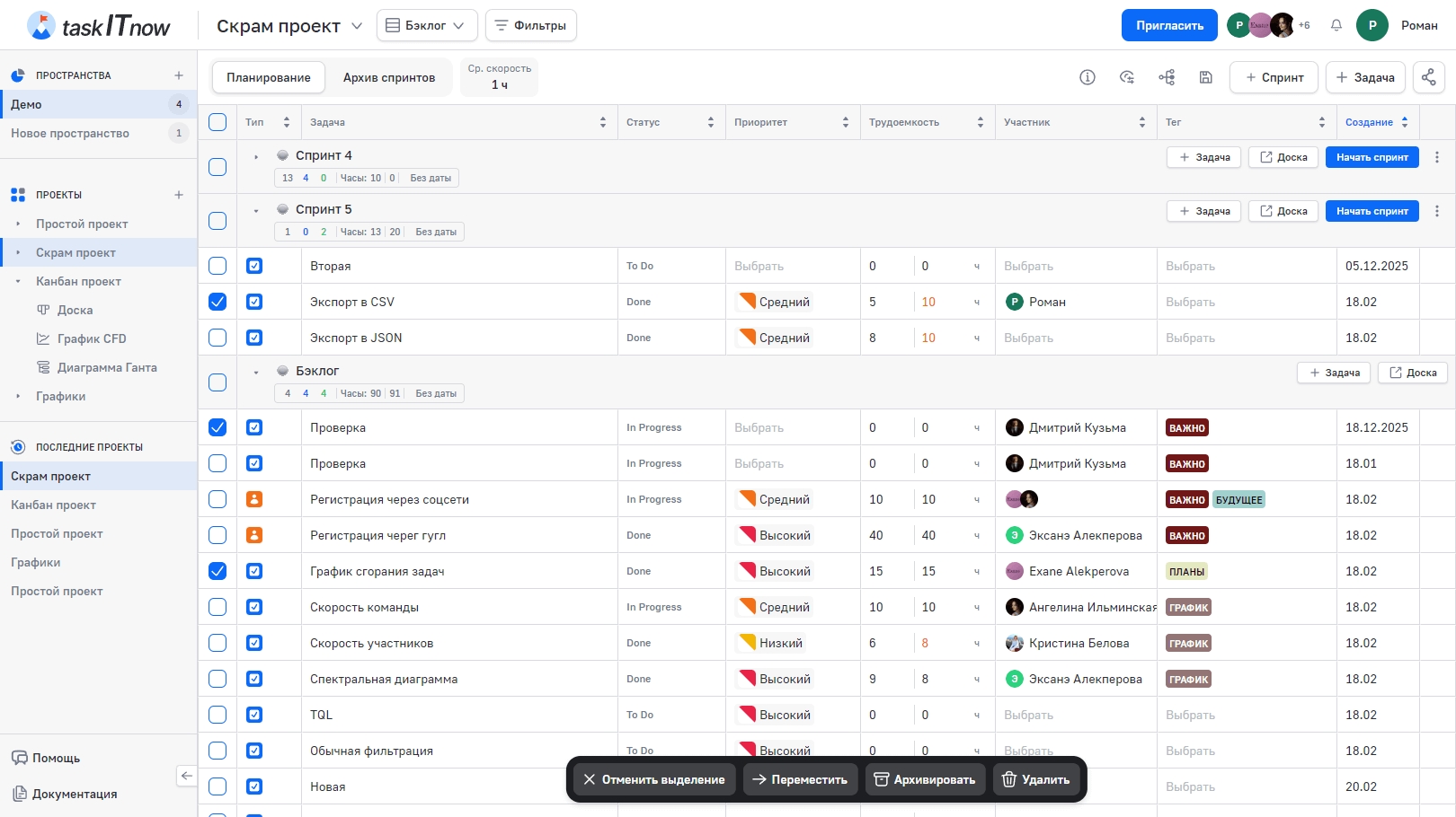 Перетащите задачу из одного спринта в другой или в бэклог, чтобы изменить её привязку. При перемещении между спринтами задача автоматически переназначается.