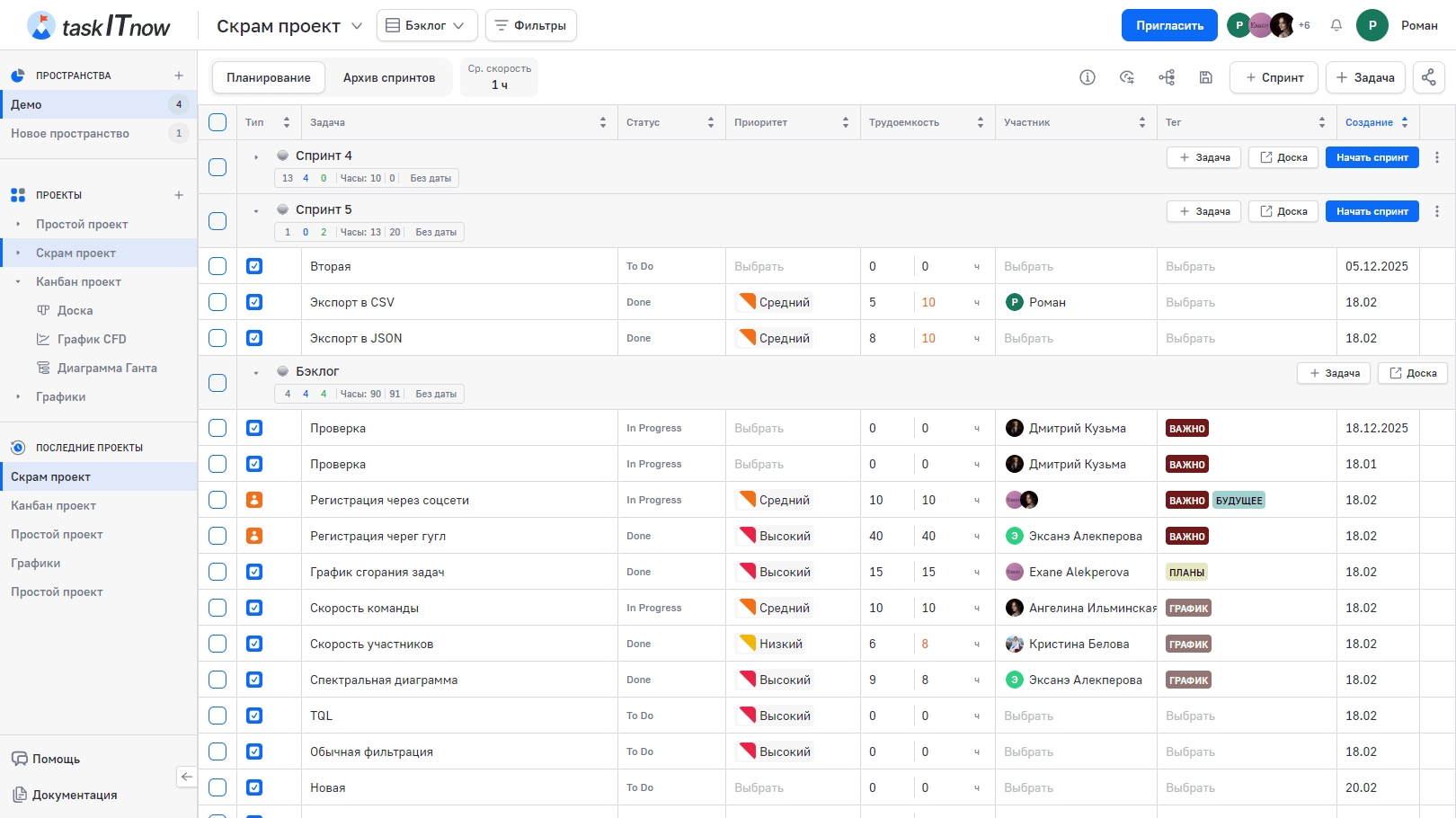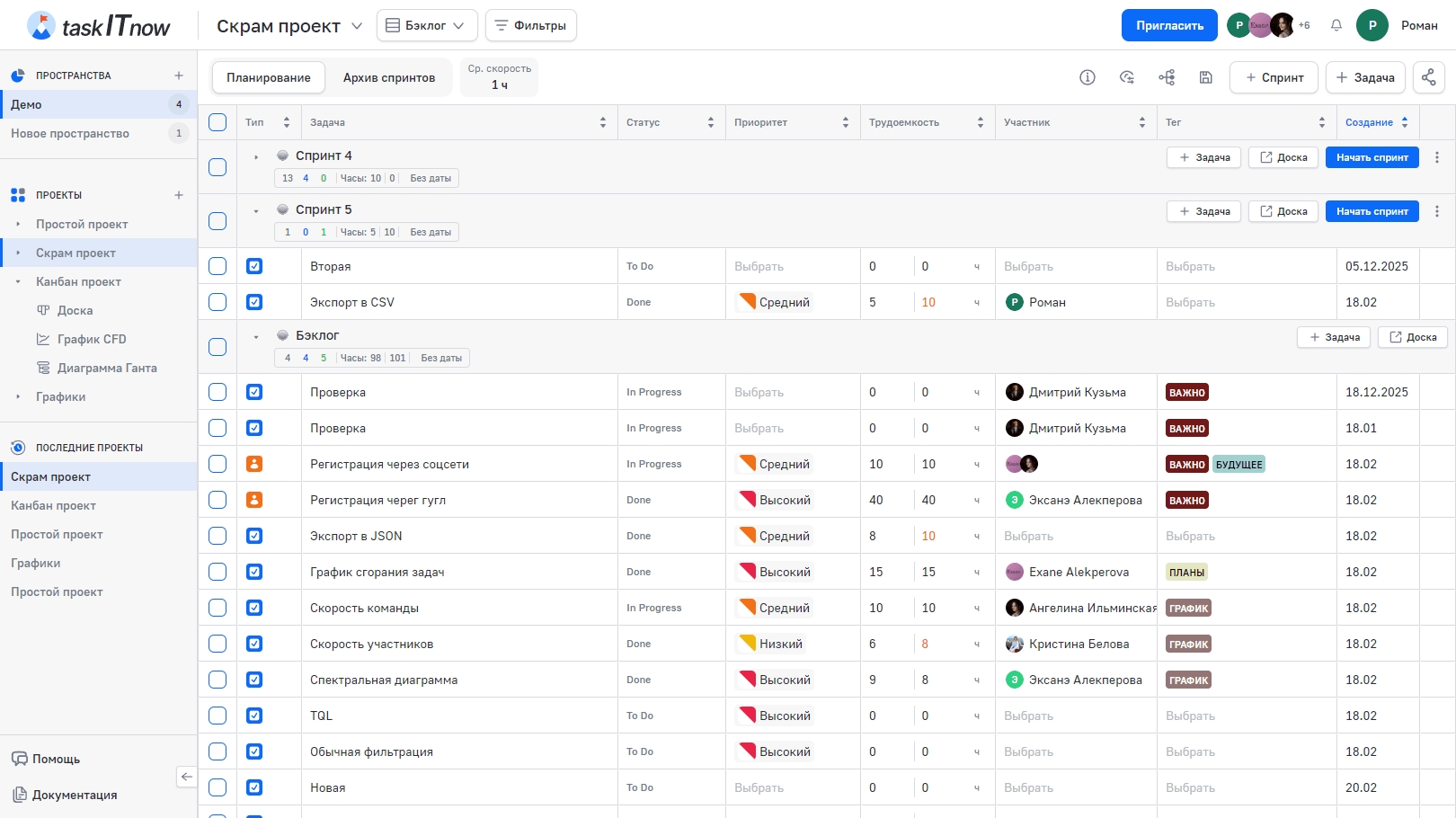 Бэклог — представление задач, сгруппированных по спринтам. Доступно только для проектов с методологией Scrum. Позволяет планировать работу: распределять задачи по спринтам, управлять приоритетами и отслеживать объём запланированных работ.