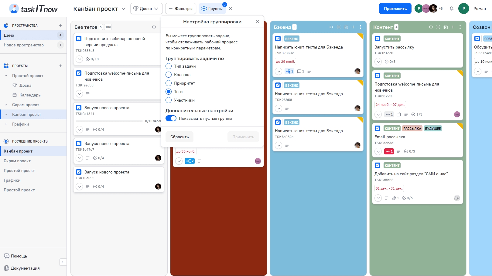 По умолчанию доска группирует задачи по колонкам. Вы можете изменить группировку, нажав кнопку «Группы» на панели инструментов.