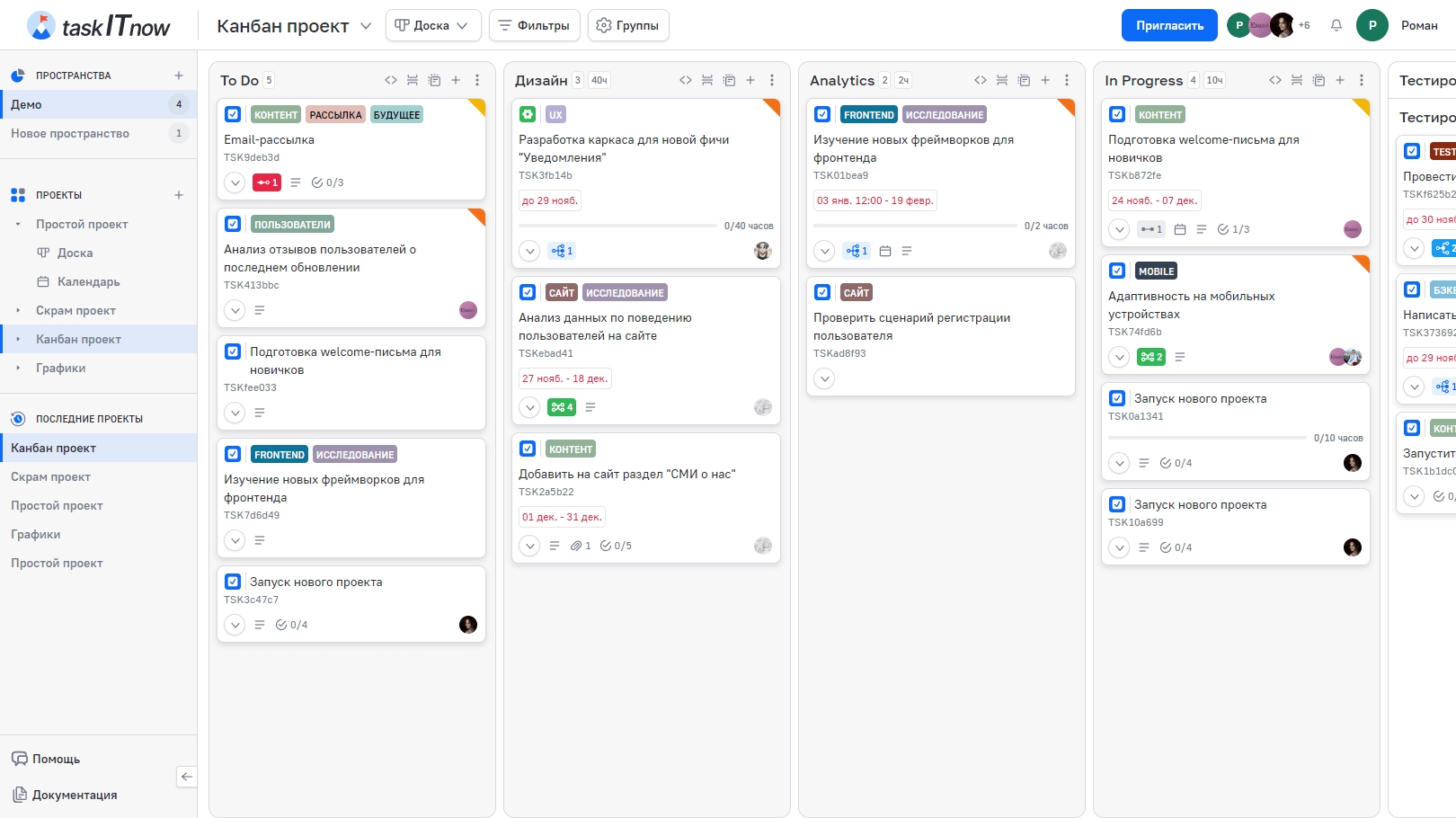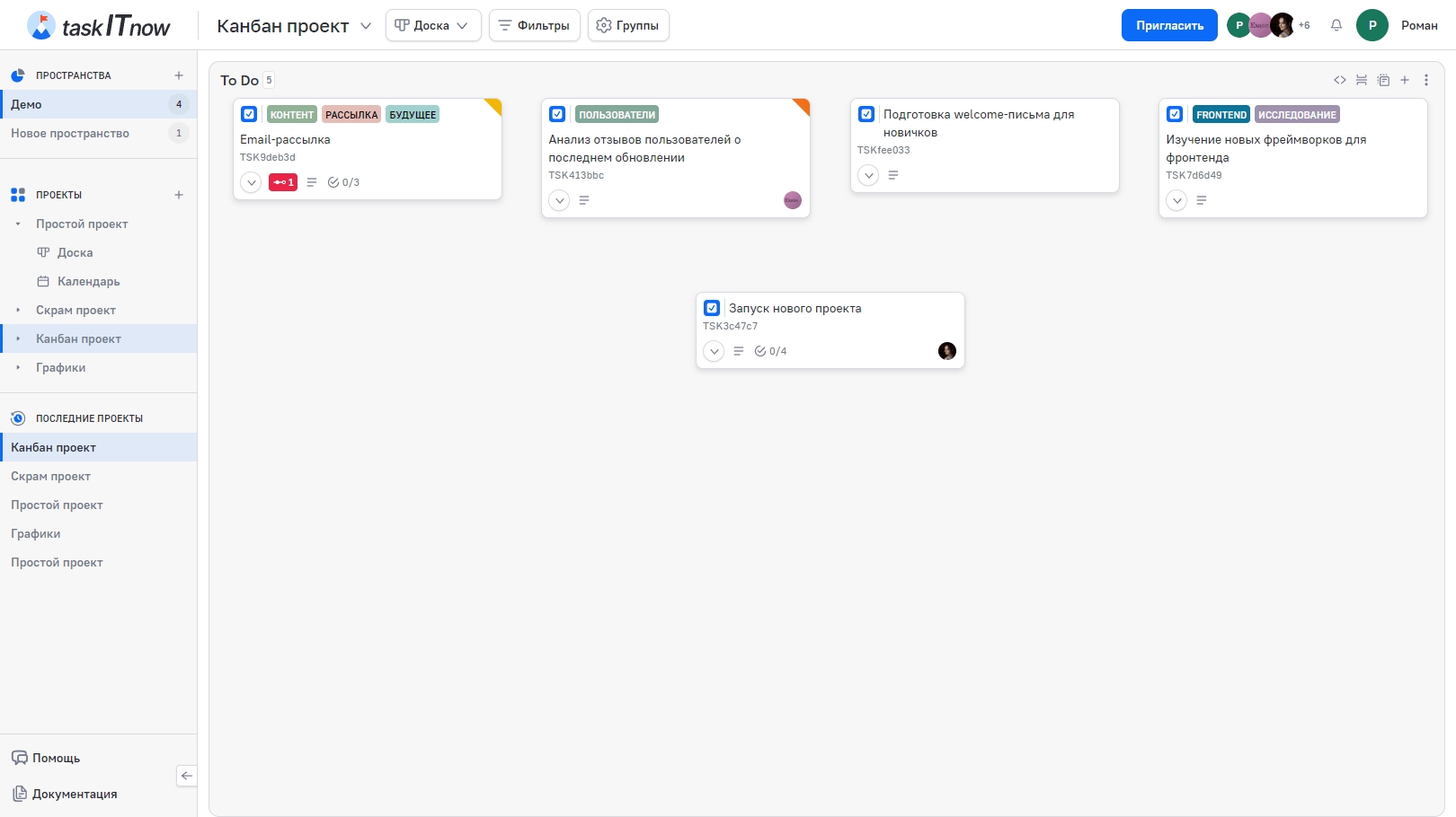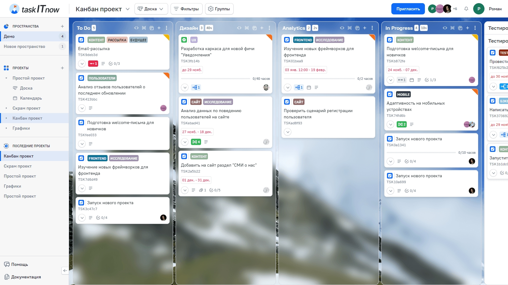 Доска — основное представление проекта в taskITnow. Задачи отображаются в виде карточек, распределённых по колонкам. Каждая колонка соответствует этапу рабочего процесса: «To Do», «In Progress», «Done» и т. д. Подробное описание колонок — в разделе Колонки доски.