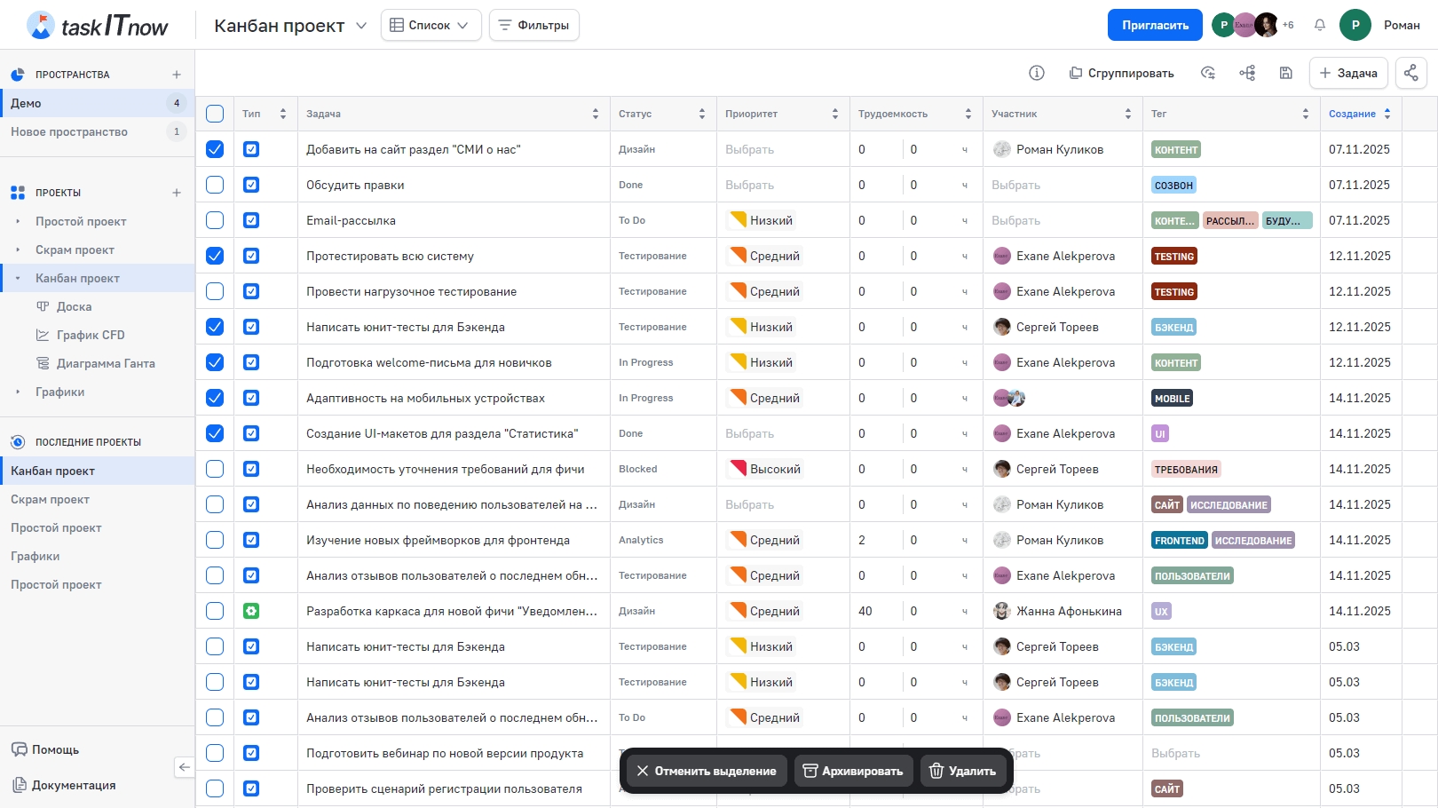 Выберите несколько задач с помощью чекбоксов в левой колонке. Над таблицей появится панель массовых действий: