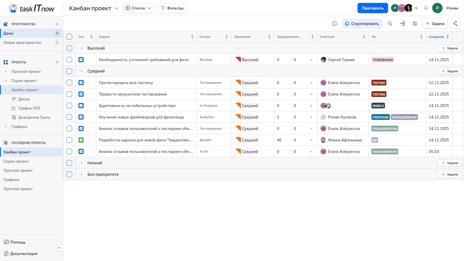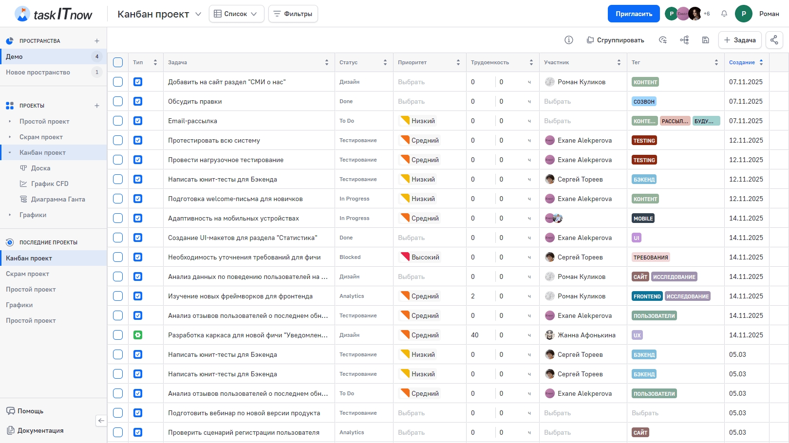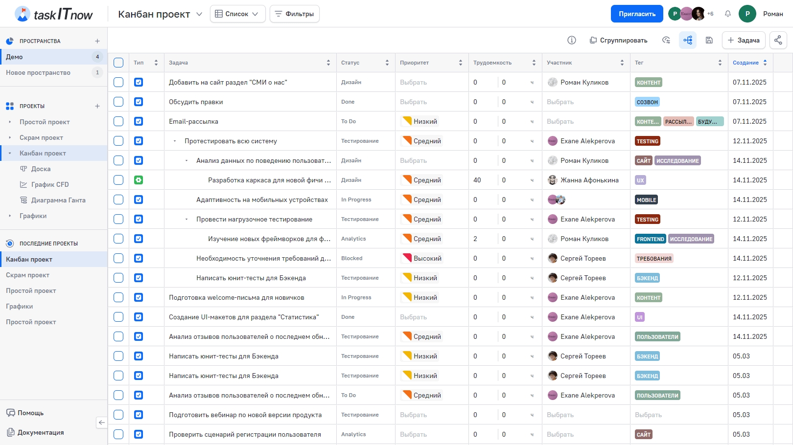 Сортировка доступна для колонок: Задача, Номер, Трудоёмкость, Срок, Теги, Участники, Тип, Статус, Приоритет, Создание.